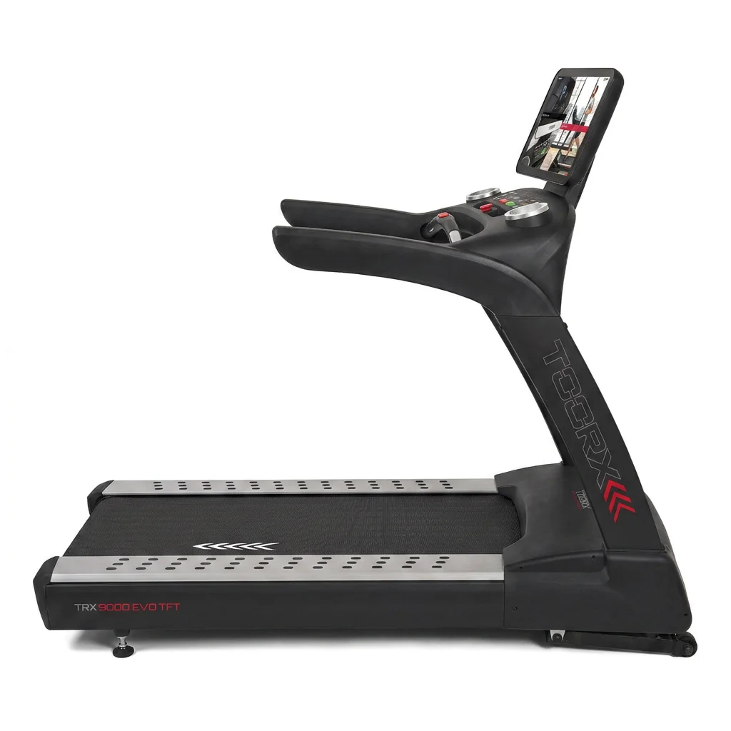Medtem ko standardni TRX-9000 EVO ponuja klasično LED konzolo z zasloni za vadbo, gre TFT različica korak naprej: 21,5-palčni zaslon HD resolucije na dotik deluje kot polnopravna Android konzola z vnaprej nameščenimi aplikacijami (Chrome, Facebook, Instagram, YouTube, Netflix, Spotify, Prime Video). Vsak uporabnik fitnes centra ima pred sabo zasebni zaslon z vsebino po lastni izbiri. Poleg tega konzola podpira brezžično polnjenje pametnih telefonov (Qi standard, kjer naprava to podpira) — vaš telefon je med tekom vedno napolnjen in pri roki.