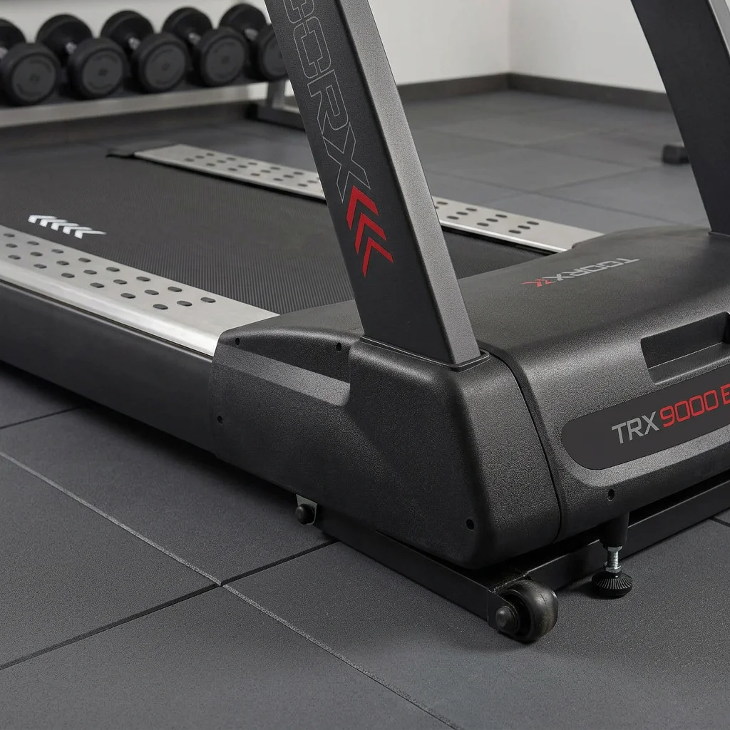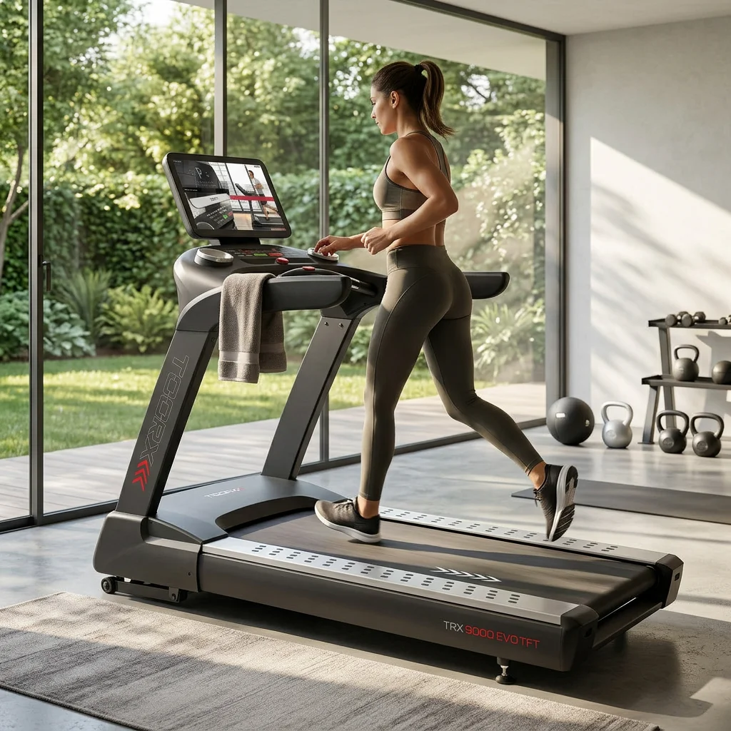 Tako kot pri standardni različici TRX-9000 EVO je tudi TFT model opremljen z AC motorjem 6 HP (vrh 8 HP) — industrijskim tipom motorja brez ogljikovnih ščetk, ki deluje zanesljivo pri večurni, vsakodnevni obremenitvi. Robustna jeklena konstrukcija s skupno težo 220 kg zagotavlja popolno stabilnost pri sprintu na 25 km/h, naklon pa pokriva celoten razpon od 0 do 19 % v 20 natančno nastavljivih stopnjah.